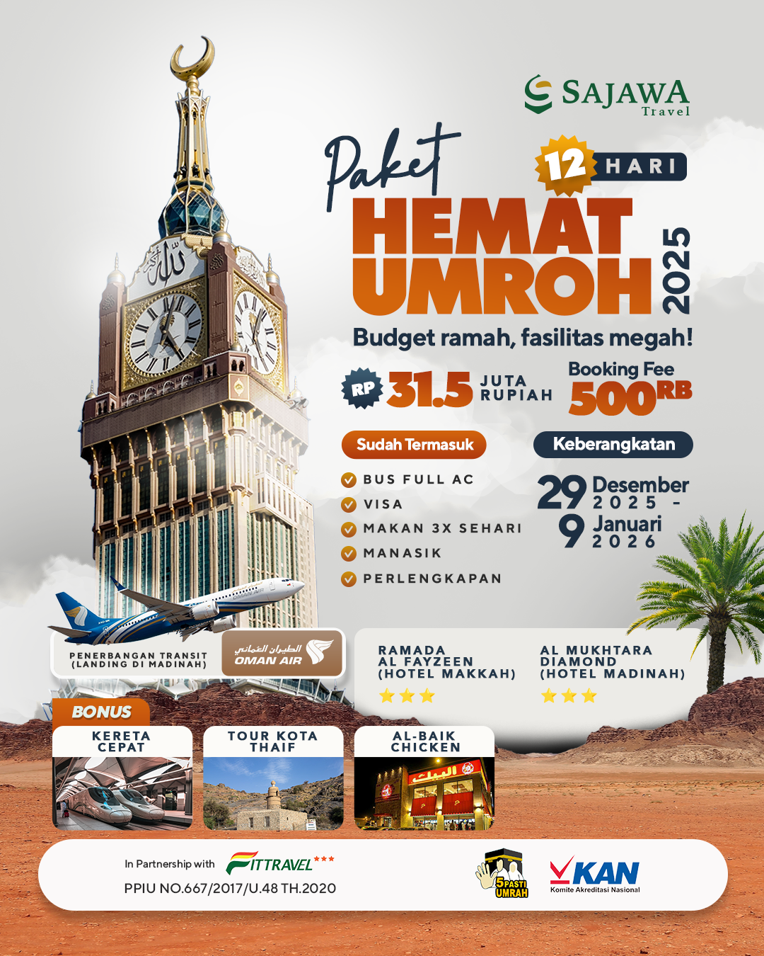 Paket Umroh Hemat 12 Hari ini bisa kamu dapatkan hanya dengan Rp31,5 juta. Budget tetap ramah, tapi fasilitasnya megah dan pengalaman ibadahnya insyaAllah berkesan.